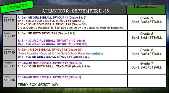 In addition to the traditional walk/run, Terry Fox Day will be our first Spirit Day of the year! Students are asked to wear the following colours depending on their grade: 6 – Red, 7 – Blue, 8 – Purple, 9 – Green. In the second half of the day, we will be having our first DANCE. The Dance will run after our nutrition break until the end of the day (11:15am-12:45pm).