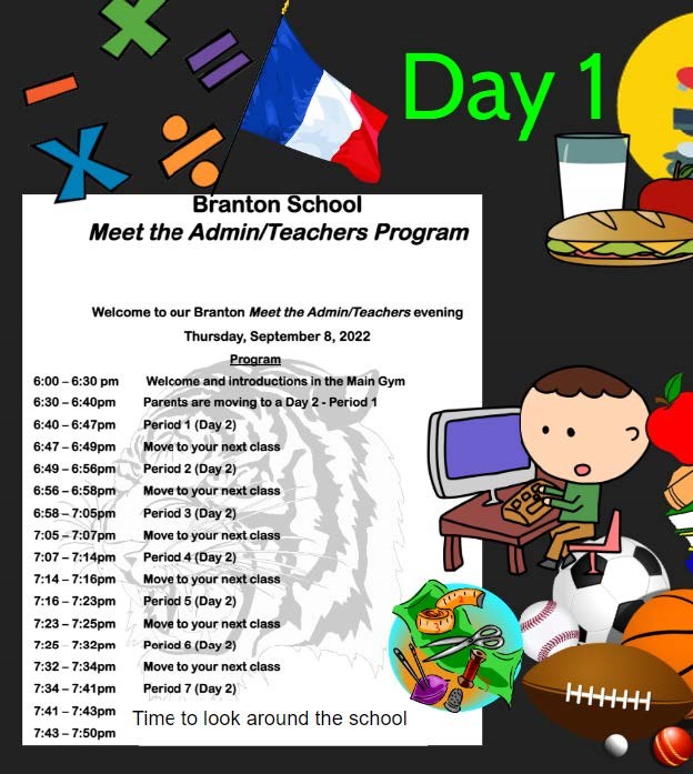 September 6 (6-8pm): Meet at Branton School the Admin and Teachers (Doors will open at 5:40pm.
